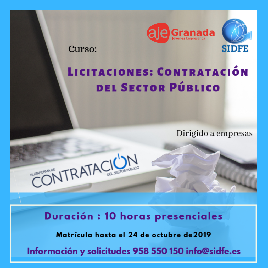 AJE Granada junto con SIDFE realizaremos un “Curso de licitaciones para la Contratación del Sector Público”. Se celebrará los días 28, 29 y 30 de octubre en la sala de formación de la Confederación Granadina de Empresarios (c/ Maestro Montero, 23).