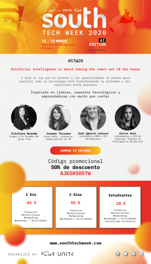 Llega a Granada una nueva edición del South Tech Week, el mayor Congreso de Tecnología en la ciudad. Una experiencia única que te permitirá conocer e intercambiar historias de éxito, mostrar tus ideas más innovadoras, conectarte con un infinito de oportunidades en la red y potenciar tu espíritu emprendedor.
