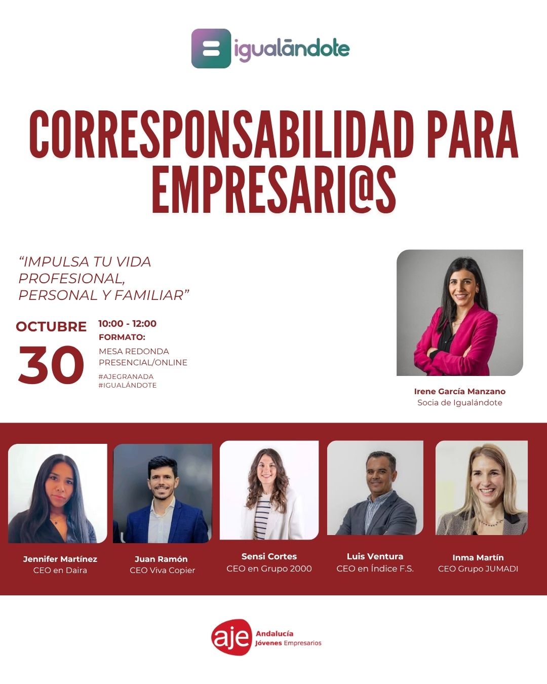 El próximo jueves 30 de octubre, te invitamos a participar en un encuentro muy especial en HUBICC: un taller práctico sobre corresponsabilidad, impartido por Irene Gracía Manzano, socia de Igualándote y miembro de la Junta Directiva de AJE.