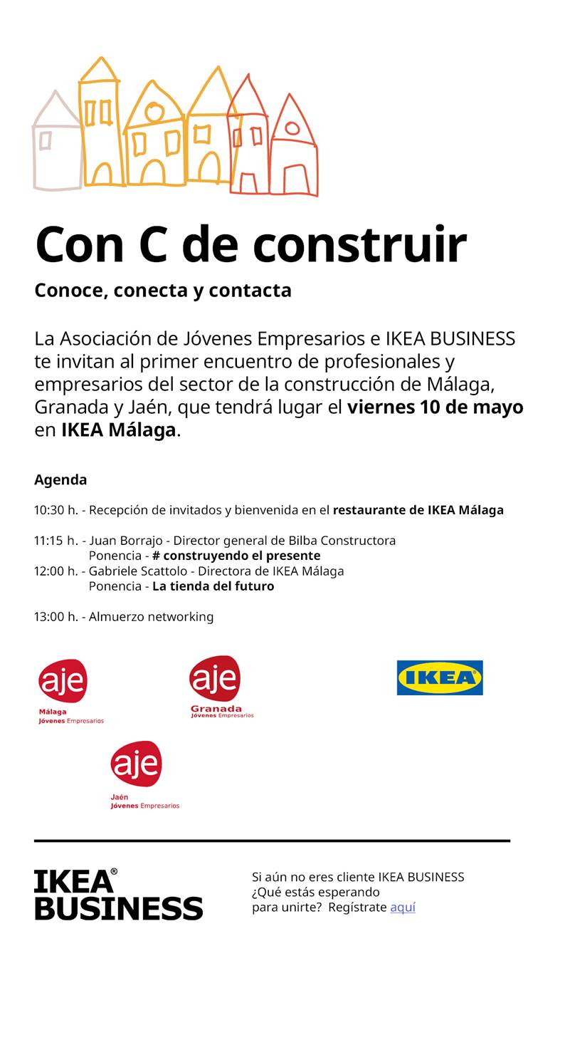 La Asociación de Jóvenes Empresarios e IKEA business te invitan al primer encuentro de profesionales y empresarios del sector de la construcción de Málaga, Granada y Jaén, que tendrá lugar el viernes 10 de mayo en IKEA Málaga.