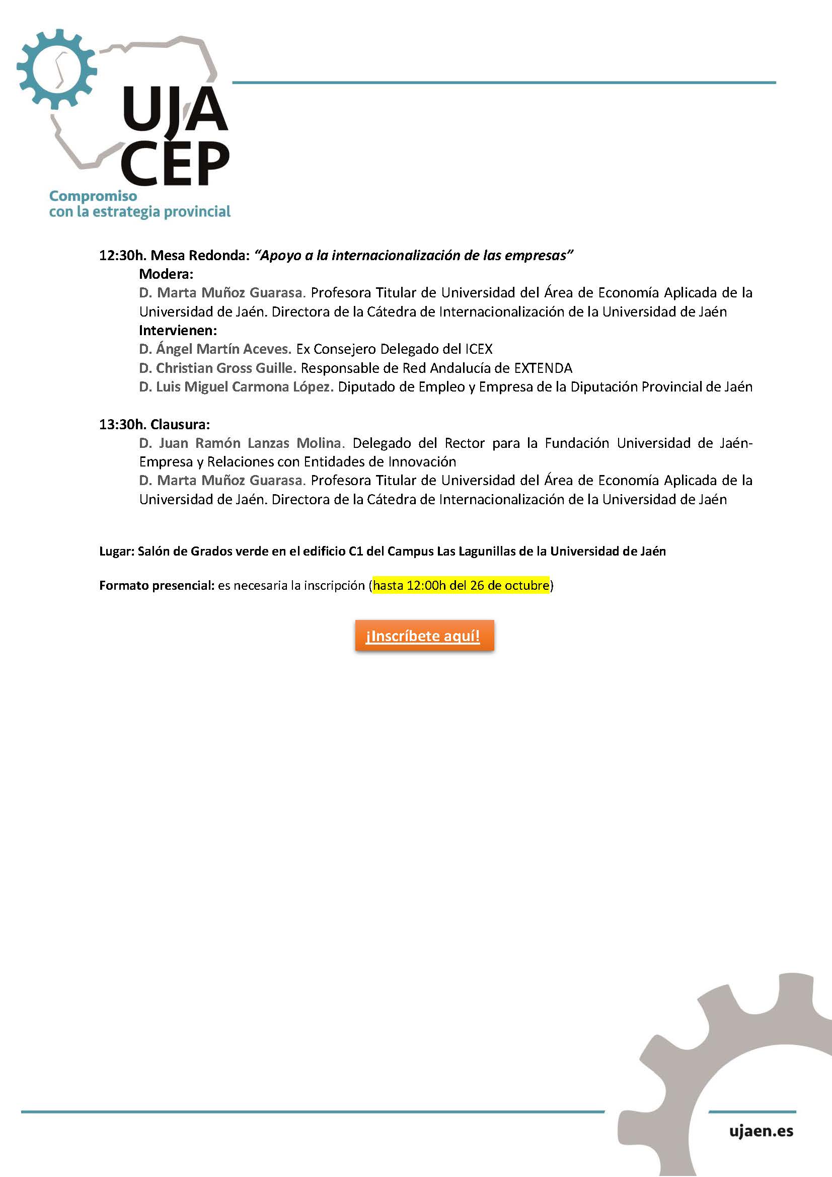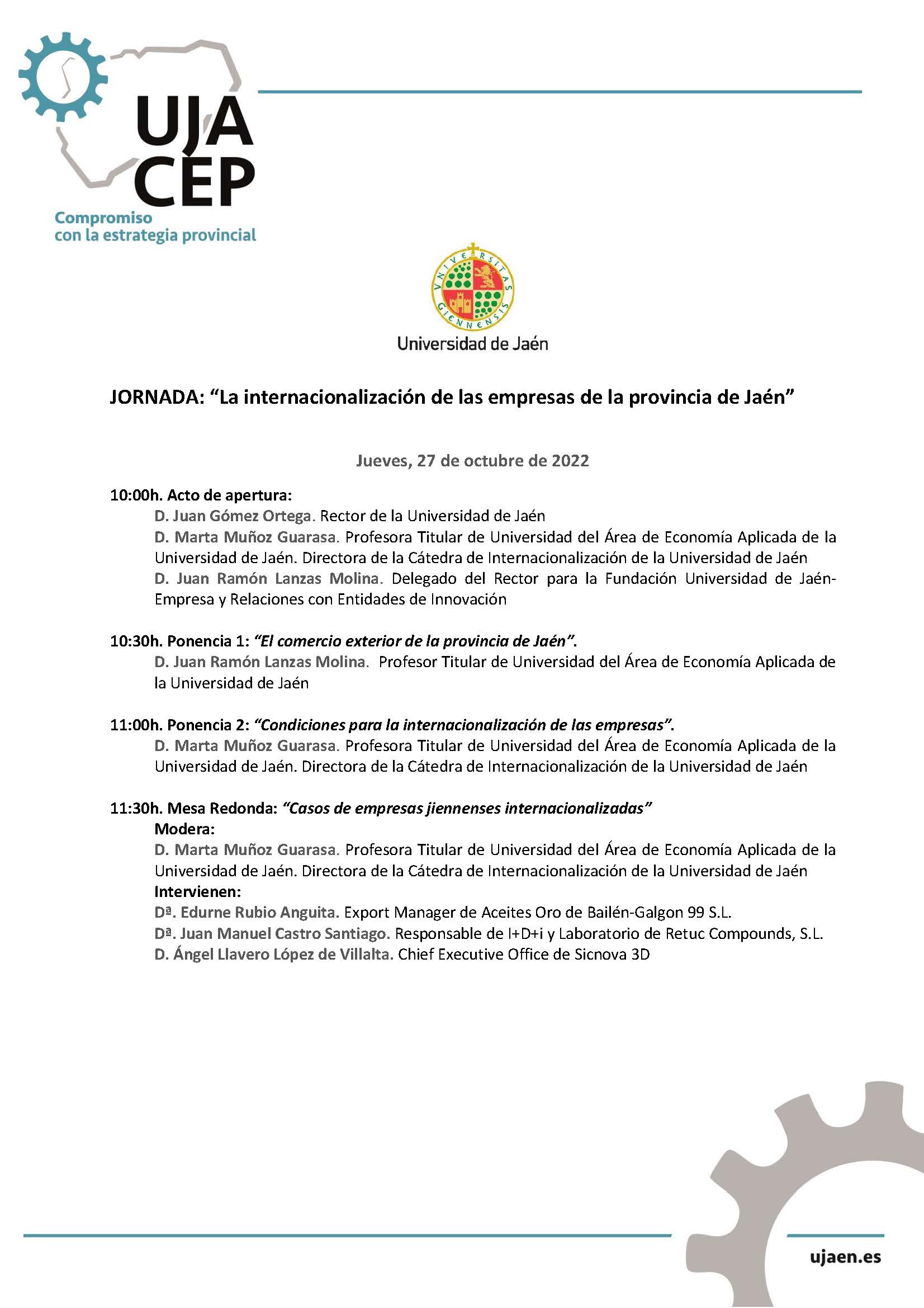 La Universidad de Jaén organiza una nueva jornada del programa #UJACEP para abordar la internacionalización de las empresas de la provincia de Jaén, el 27 de octubre a las 10.00 h, en el Salón de Grados verde en el edificio C1 del Campus Las Lagunillas de la Universidad de Jaén.