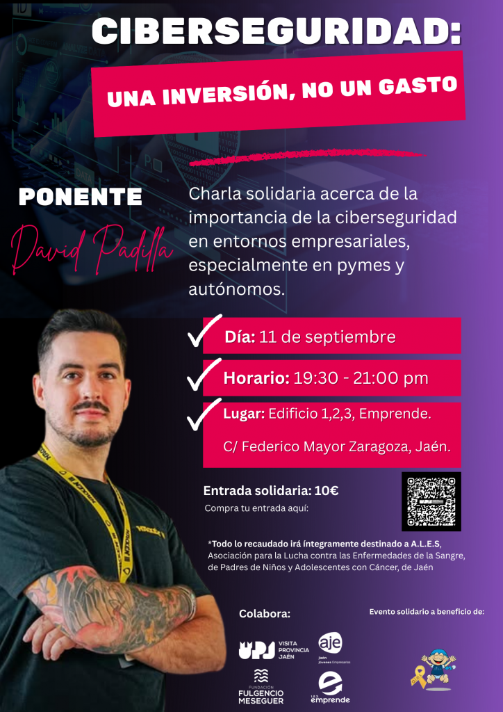 AJE Jaén, en colaboración con David Padilla, Fundación Fulgencio Meseguer, 1,2,3, Emprende y Visitar Provincia de Jaén, organiza una charla solidaria sobre la importancia de la ciberseguridad en empresas, especialmente pymes y autónomos a favor de la Asociación A.L.E.S. (Asociación para la Lucha contra las Enfermedades de la Sangre, de Padres de Niños y Adolescentes con Cáncer de Jaén).