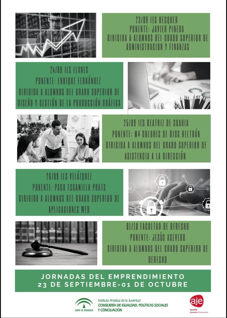 El próximo lunes 23 AJE Sevilla da inicio a las jornadas del emprendimiento en colaboración con el Instituto Andaluz de la Juventud de la Junta de Andalucía. Estas jornadas que se extenderán hasta el día 1 de octubre y comprenderán 5 ponencias en diferentes centros formativos que abarcan desde Grados Superiores de FP hasta la Universidad de Sevilla.