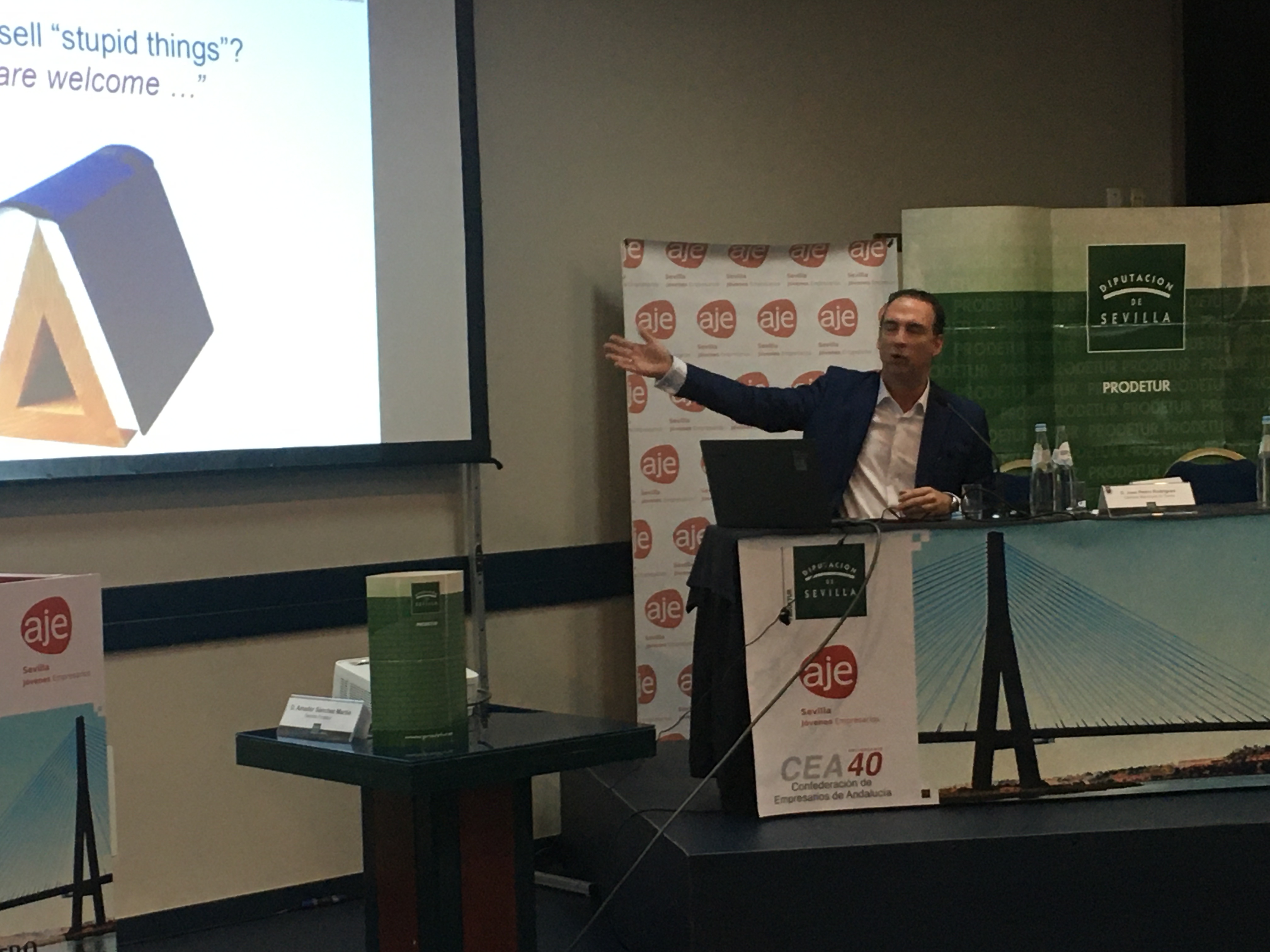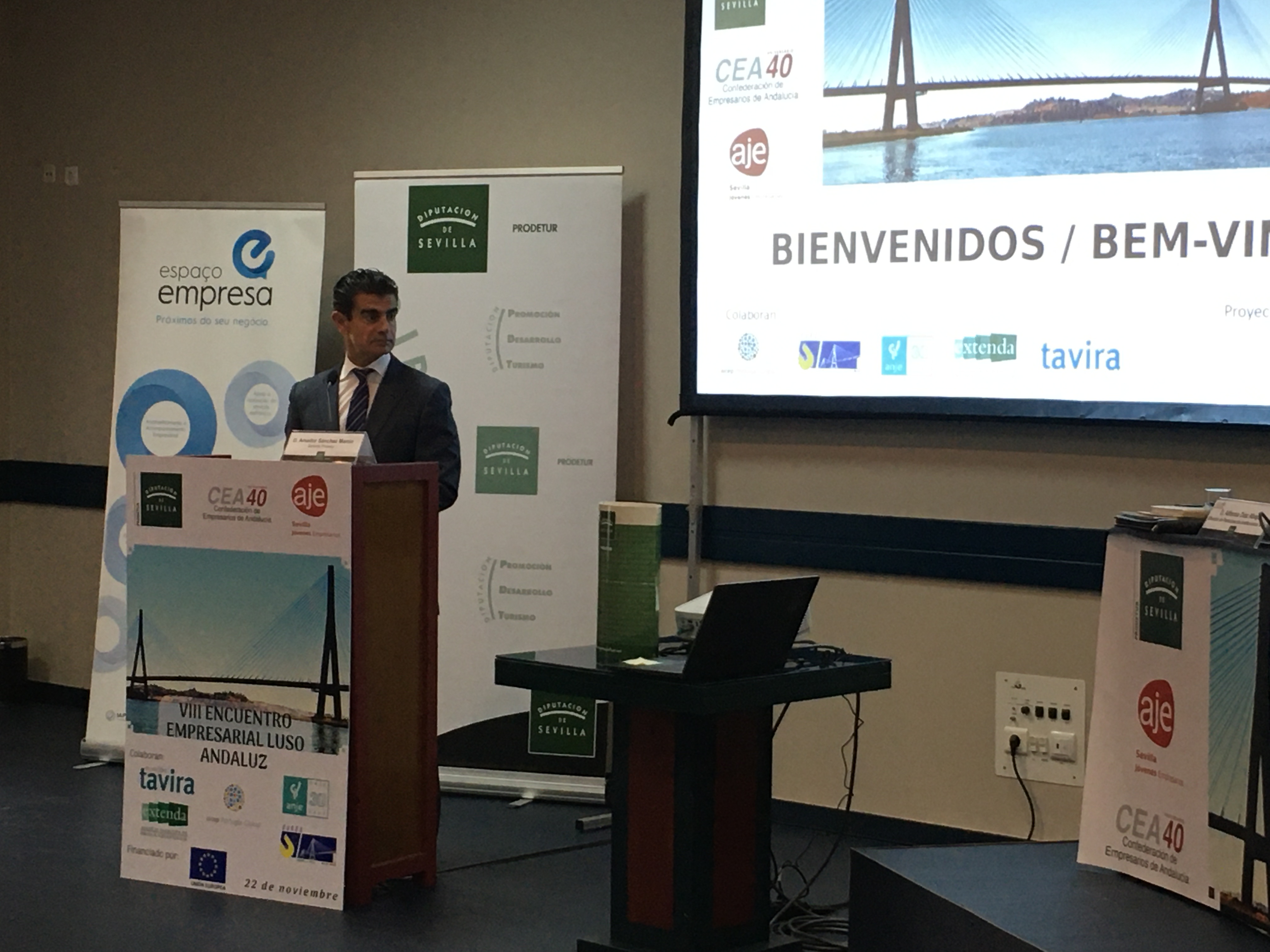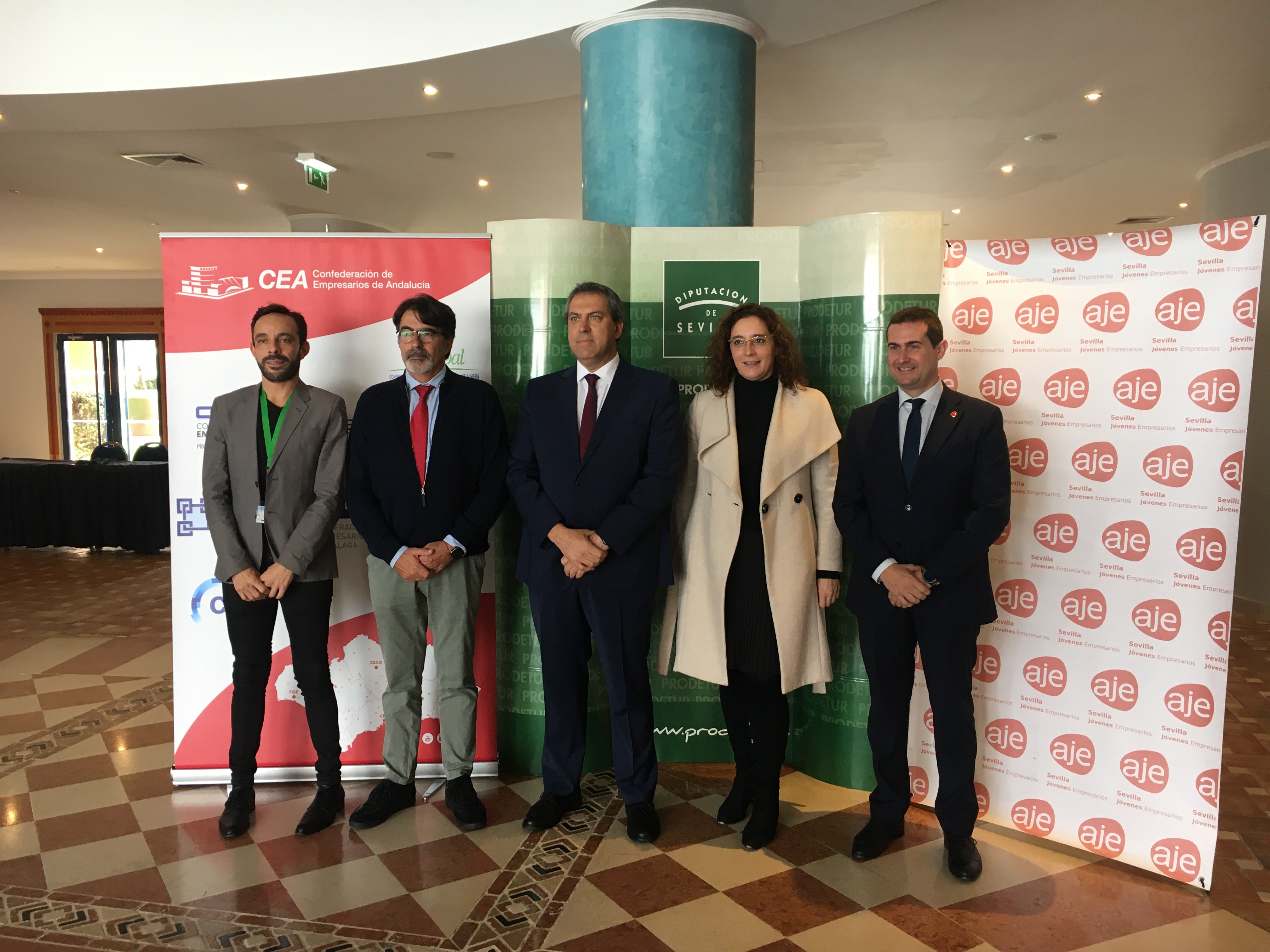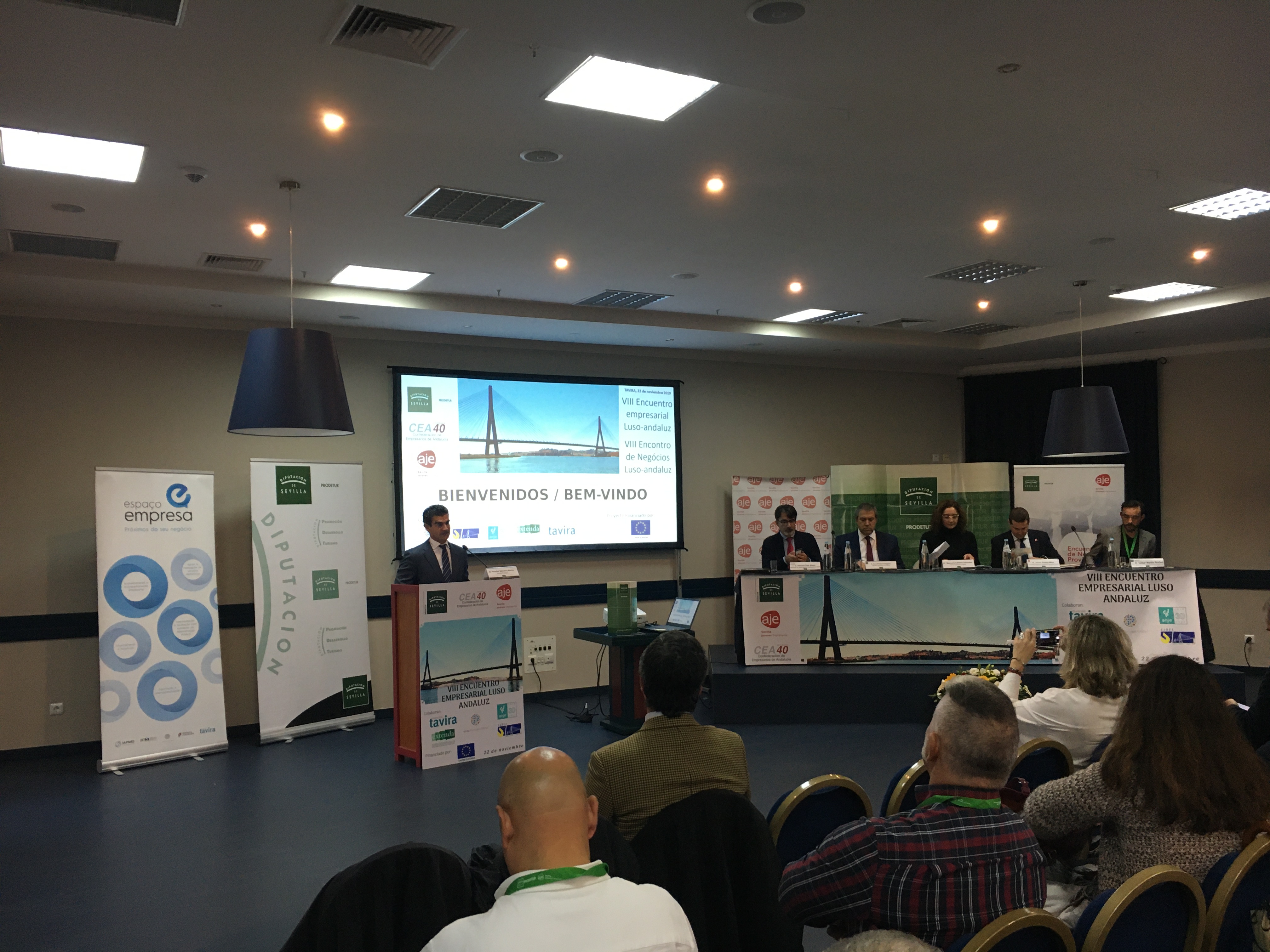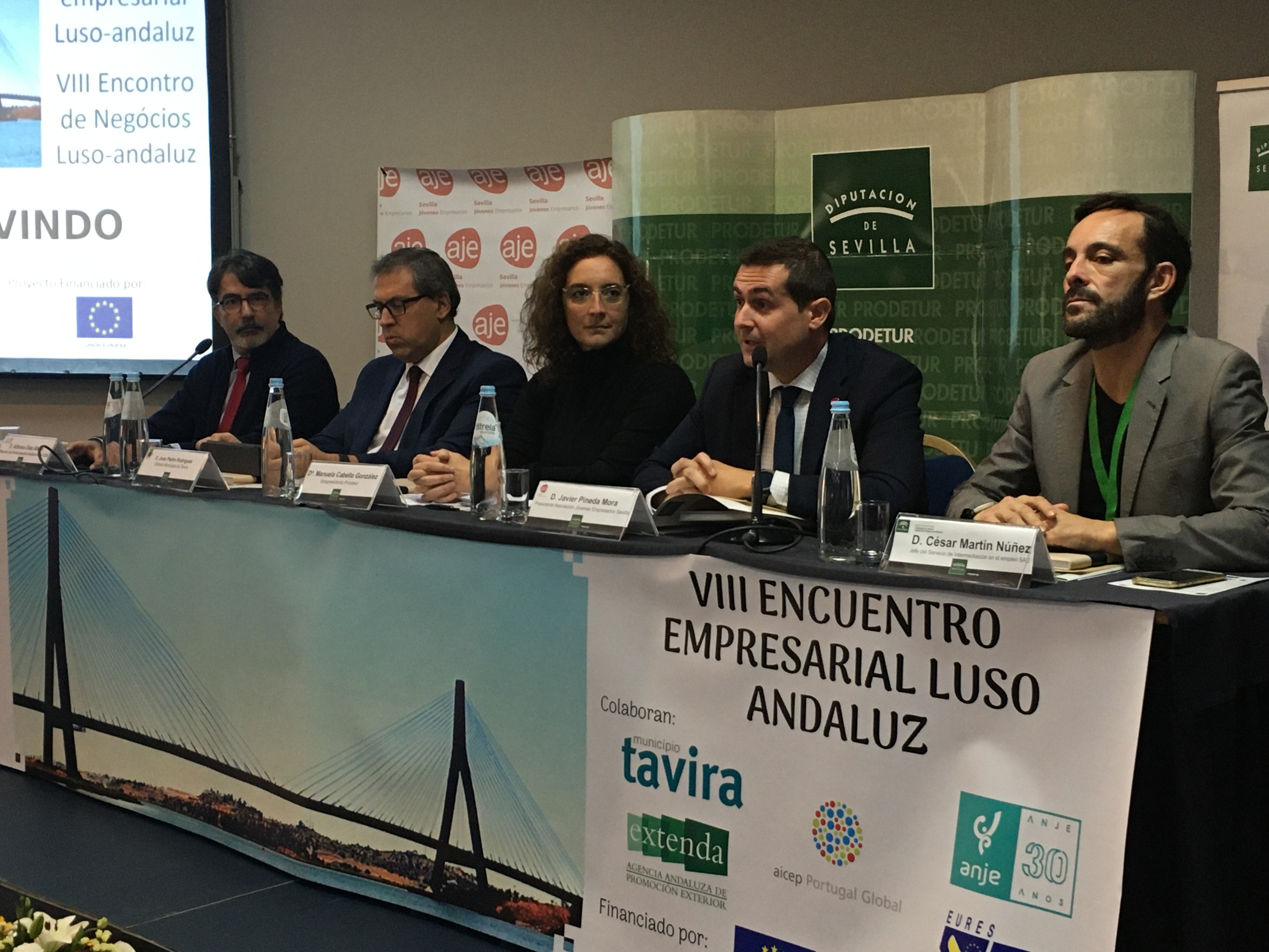 El presidente de AJE Sevilla, Javier Pineda, junto a la vicepresidenta de Prodetur, Manuela Cabello, su gerente Amador Sánchez, Alfonso Díaz Abajo, Director de Participación Institucional de la Confederación de Empresarios de Andalucía, Joao Pedro Rodrigues, representante de la Cámara de Comercio de Tavira y César Martín, Jefe de Servicio del Servicio Andalaluz de Empleo de la Junta de Andalucía, dieron la bienvenida a los asistentes del VIII Encuentro Empresarial Luso-Andaluz, organizado por Prodetur y la Asociación de Jóvenes Empresarios de Sevilla (AJE Sevilla) y la colaboración de la Associação Nacional de Jovens Empresários (ANJE), la Confederación de Empresarios de Andalucia (CEA), la Agencia Andaluza de Promoción Exterior (Extenda), AICEP Portugal Global y la Cámara Municipal de Tavira.