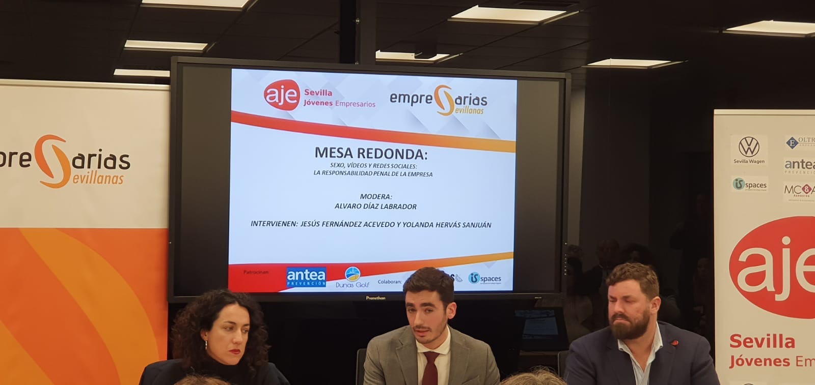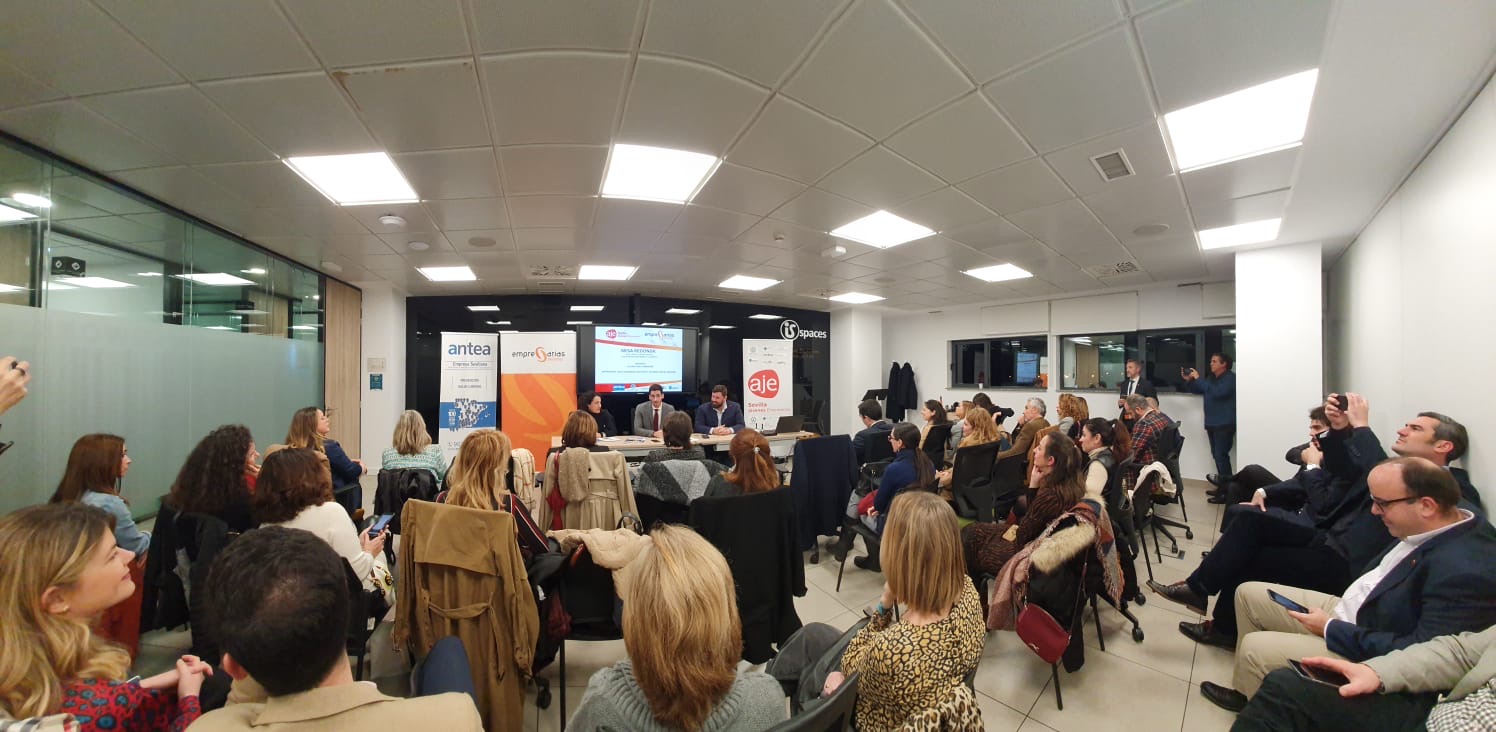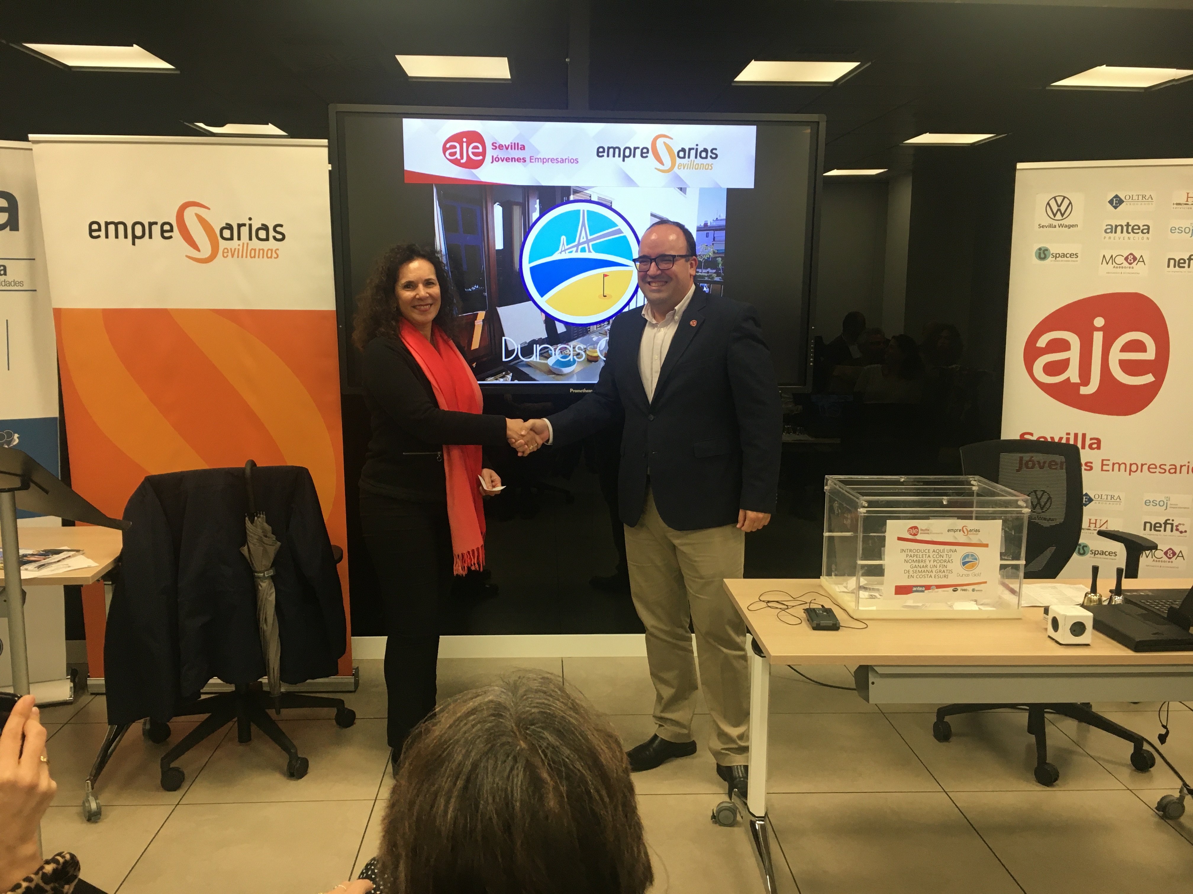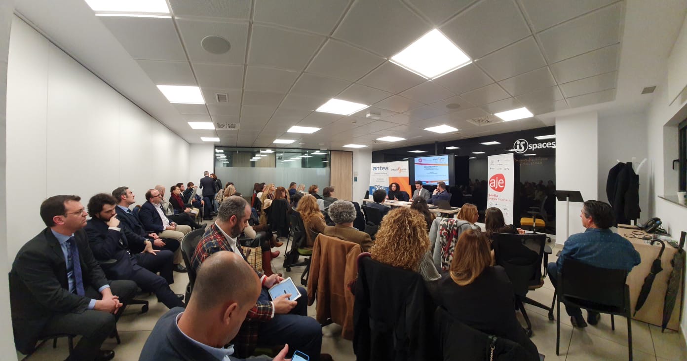 El Encuentro celebrado en las instalaciones de la Avda. Diego Martínez Barrio fue patrocinada por ANTEA Prevención y Dunas Golf. Tras la bienvenida de Javier Pineda, presidente de AJE Sevilla y Vanessa Muñoz, presidenta de Empresarias Sevillanas así como del director de IsSpaces, ANTEA Prevención presentó a los asistentes las últimas iniciativas empresariales de esta empresa y se centró posteriormente en la aplicación “ANTEA CHEKIN, solución tecnológica para registro horario laboral.