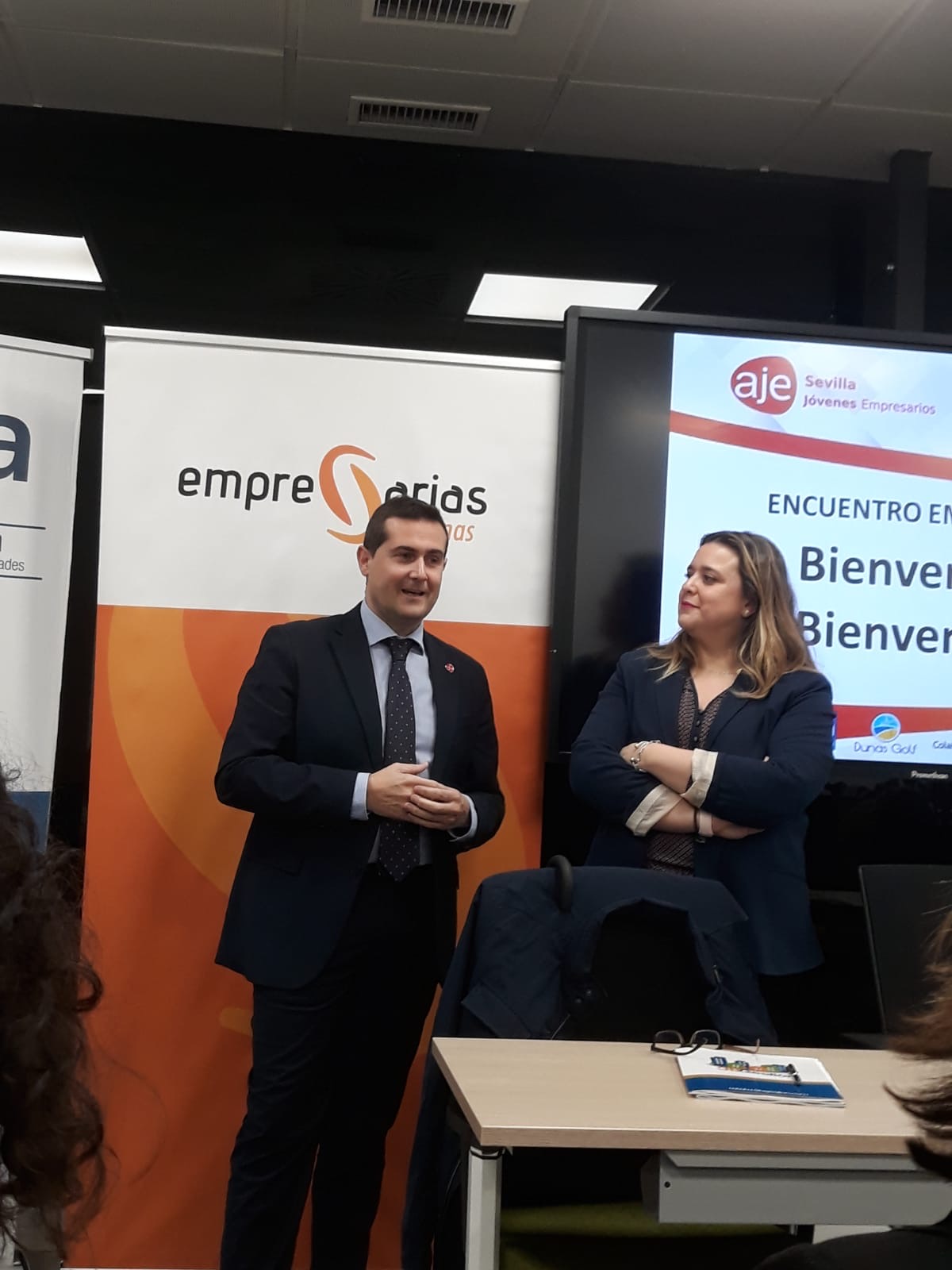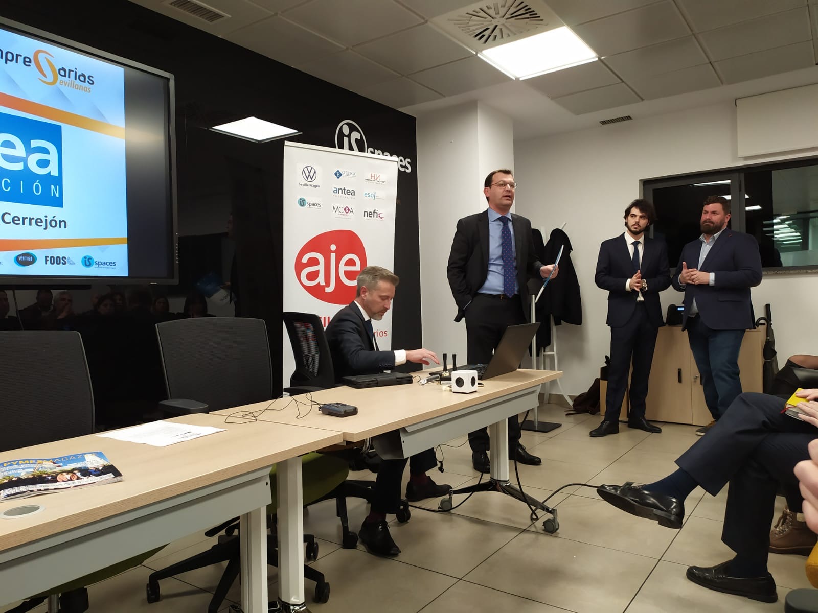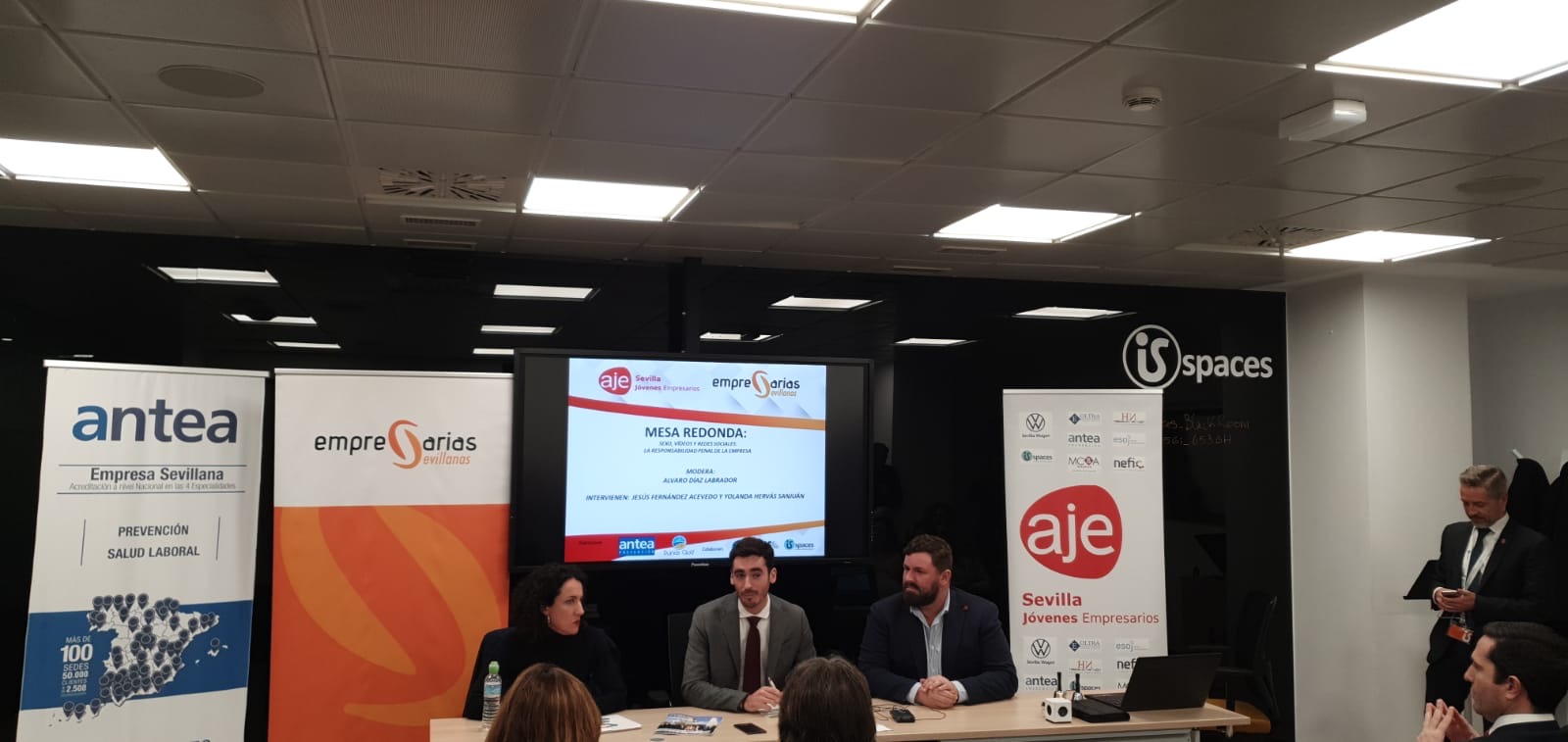 El Encuentro celebrado en las instalaciones de la Avda. Diego Martínez Barrio fue patrocinada por ANTEA Prevención y Dunas Golf. Tras la bienvenida de Javier Pineda, presidente de AJE Sevilla y Vanessa Muñoz, presidenta de Empresarias Sevillanas así como del director de IsSpaces, ANTEA Prevención presentó a los asistentes las últimas iniciativas empresariales de esta empresa y se centró posteriormente en la aplicación “ANTEA CHEKIN, solución tecnológica para registro horario laboral.