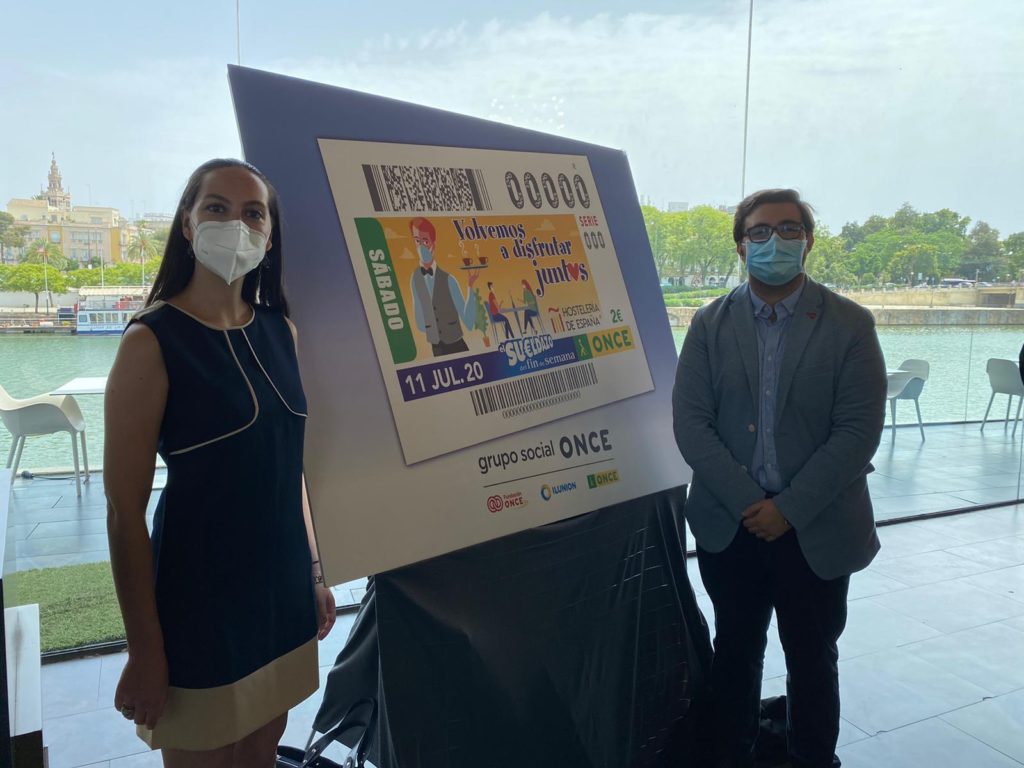 En la mañana del miércoles 8 de julio de 2020, la Presidenta de la Comisión de Igualdad de AJE Sevilla, Aida Escudero, y el Gerente, Agustín Morilla, han asistido a la presentación del cupón del Grupo Social La ONCE, dedicado a la Confederación de Asociaciones de Hosteleros de España, en el Restaurante Abades Triana.
